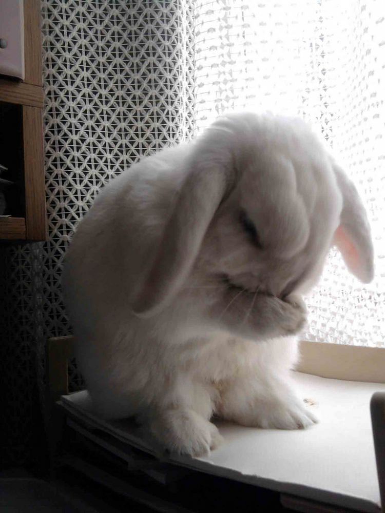 Dobbantás a hátsó lábakkal: furcsa, esetleg rémisztő hang esetén figyelmeztetés a többieknek, olyan "riadó" féle. Az egyáltalán nem baj, ha másik nyuszi nincs a közelben, azért még jeleznek. Sikeres párzás után a bakok ütemesen dobbantgatnak, ez olyan, mintha ezzel is nyomatékosítani akarnák "férfiasságukat". A fogak csikorgatása: fájdalomra utaló jelzés. Soha ne hagyjuk figyelmen kívül nyuszink fogcsikorgatását, feltétlenül derítsük ki az okát, ha másképpen nem megy vigyük el állatorvoshoz. A fogak ropogtatása: a nyuszi nagyon jól érzi magát. Általában simogatásra, cirógatásra, puszilgatásra szoktak így reagálni, olyasmi lehet ez a nyuszóknál, mint a cicáknál a dorombolás. Általában meghitt kapcsolatot feltételez, egy nyuszi nem ropogtatja a fogát "akárkinek". Nyammogás: olyan, mint a fogak ropogtatása, azt fejezi ki, hogy a nyuszinak nagyon kellemes érzés, amit éppen csinálunk vele. Sikítás: extrém fájdalom esetén, a nyuszi nagyon meg is van rémülve. (Pl. beszorul valahova a lába, megijed, próbál menekülni és mivel teljesen bepánikol - lévén menekülő állat - még akár saját magában is kárt tesz.) Nyalogatás: puszilgatás. A nyuszi szeretetének egyik legegyértelműbb és leghatározottabb kifejezése. Bökdösődés: kedves figyelemfelkeltés, invitálás játékra, simogatásra vagy csak úgy egyáltalán arra, hogy foglalkozzunk vele. Hegyezett fülek (előre álló fülek): a nyuszi figyel, kiváncsi, érdeklődik. Az áll odadörzsölése tárgyakhoz (bármihez, ételhez is, hozzánk is): jelölés. A nyusziknak az álluk alatt is található illatmirigyük, innen kenegetik egyéni illatukat a különböző dolgokhoz, ezzel mintegy ki-/megjelölve territóriumukat. A fej és pofi mosdatása az első mancsokkal: egyrészt tisztálkodás (por, egyebek eltávolítása bajuszról, pofiról), másrészt az állon lévő illatanyagok rákenése a mancsokra, amit onnan szaladgálás közben továbbken a padlóra. Két lábra állás: érdeklődés, kémlelés, kiváncsi nézelődés. Oldalfekvés elterülve: nyuszink nyugodt, biztonságban érzi magát, elernyedt és aludni szeretne. Sokszor pihennek, alszanak nyitott szemmel, ez természetes, ne ijedjünk meg tőle. Nagy, tágra nyitott szemek, még a szem fehérje is kilátszik: a nyuszi meg van ijedve. Morcogás: kedves udvarlás. A bak nyuszik szokták hallatni, miközben körülszaladgálják szerelmük tárgyát. Ebben a kegyben nem csak nyuszilányok részesülhetnek, hanem mi emberek is. Makogás kicsit magas hangon, a nyuszi összehúzza magát és lelapul: hagyjál békén, ne piszkálj!! Cikázás, cselezés, villám módjára rohangálás, magasba ugrálás: a nyuszónak "virágos jó kedve" van. |